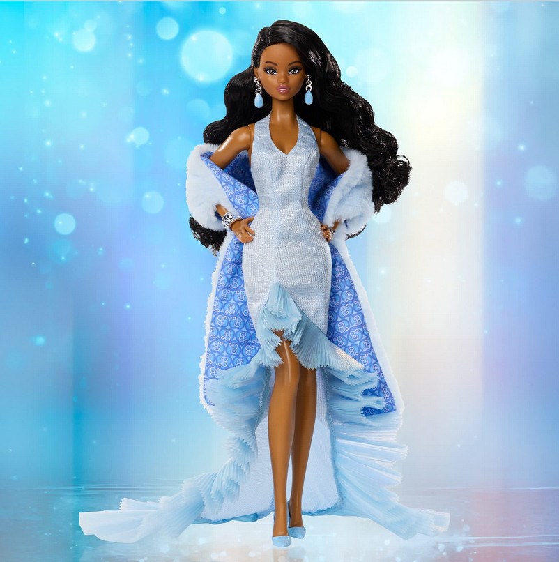 Третья кукла из коллекции Gala выходит на сцену в ослепительном образе, передающем ауру классического голливудского гламура. Барби сияет в небесно-голубом платье с бретелями через шею, облегающим лифом и асимметричным подолом, отделанным нежными оборками, создающими иллюзию русалки, когда она скользит по красной дорожке. Ее прическа с зачесанными набок волосами усиливает ощущение элегантности, а пушистый боа и эффектные украшения завершают ансамбль для высококлассного вечернего выхода.