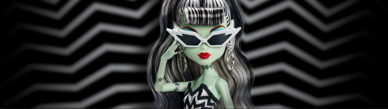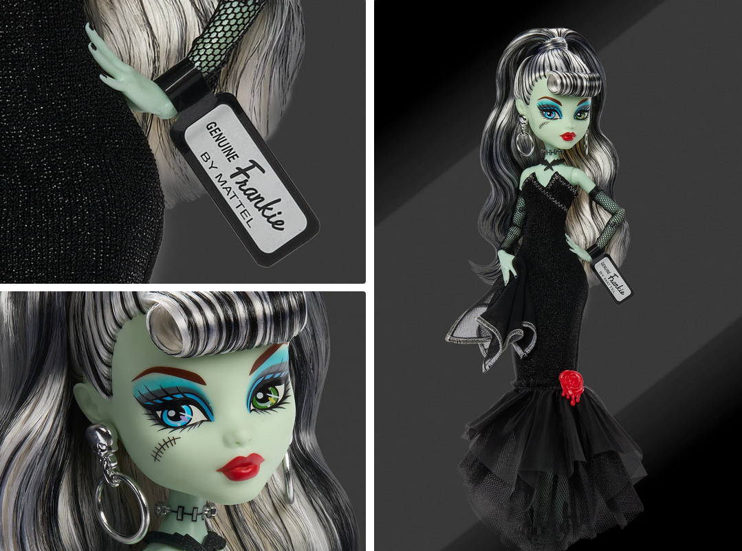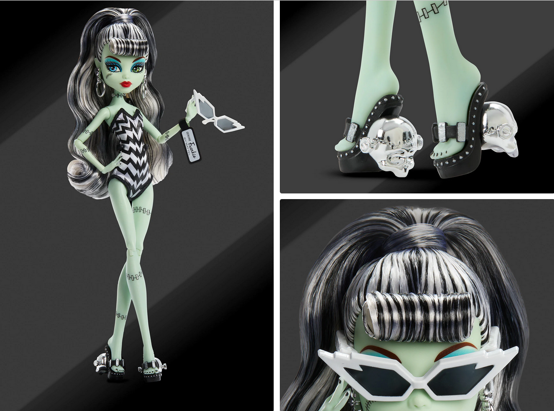 К 80-летию Mattel мы представляем вам монстр-мэшап с двумя нашими знаменитыми куклами. Отдавая дань уважения оригинальной кукле Барби 1959 года «Original Teenage Fashion Model», кукла Фрэнки Штейн сшита для пляжного дня в полосатом купальнике, солнцезащитных очках с молниями и серьгах-кольцах. У неё даже есть сменный наряд, который превратит её из дневного в пугающий! В тёмном платье, сверкающем, как ночное небо, она готова к своему моменту «Соло в центре внимания» на самой жуткой вечеринке в Малибу.